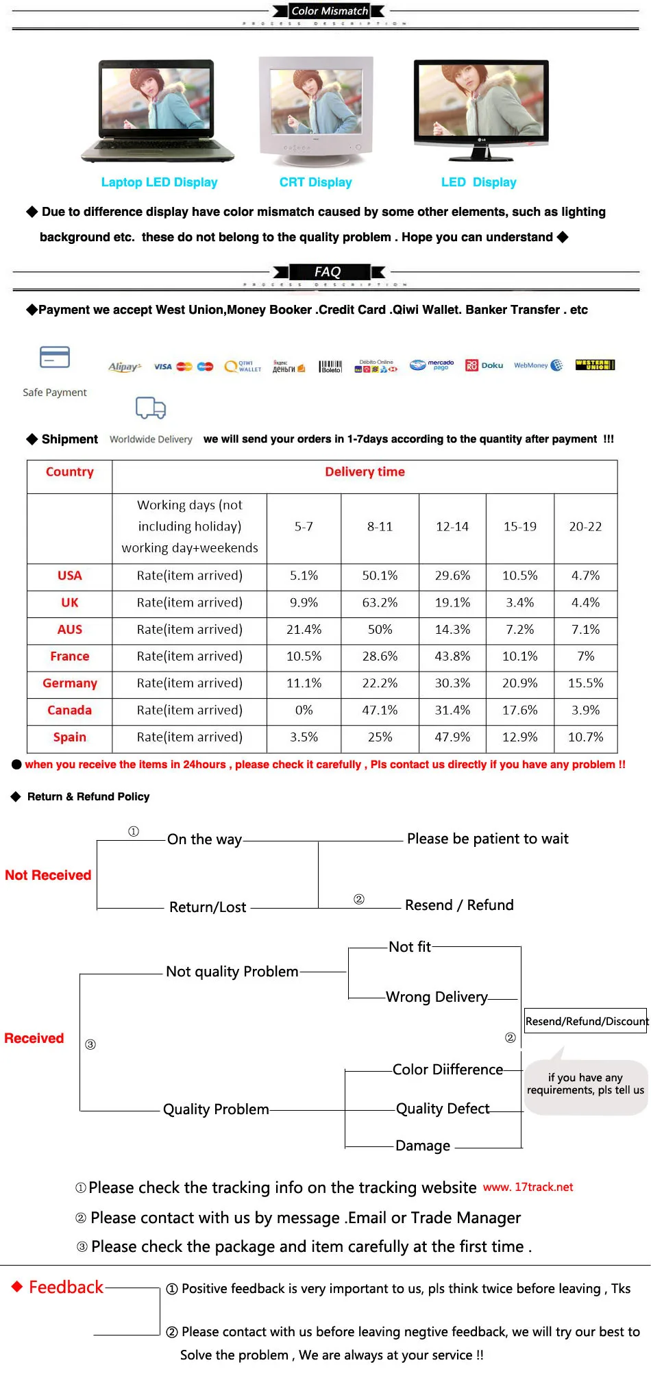 All of our shipments include Tracking with Delivery Confirmation. If the tracking information confirms that the item has been delivered to your order address but you have not received your order, please contact couriers at numbers above in order to investigate this issue. We cannot be held accountable for packages where tracking information states the package has been delivered to your order address.