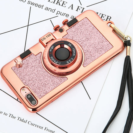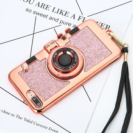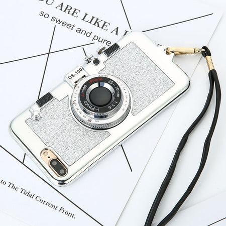 Luxury 3D Retro Camera Phone Cases For iphone 7 6 6s Plus Case Fashion Plating Soft Back Cover Long Strap Rope With Stand Holder