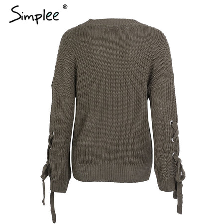 Simplee Casual o neck knitted sweater women jumper Lace up sleeve knitting pull femme 2017 autumn winter sweater pullover female