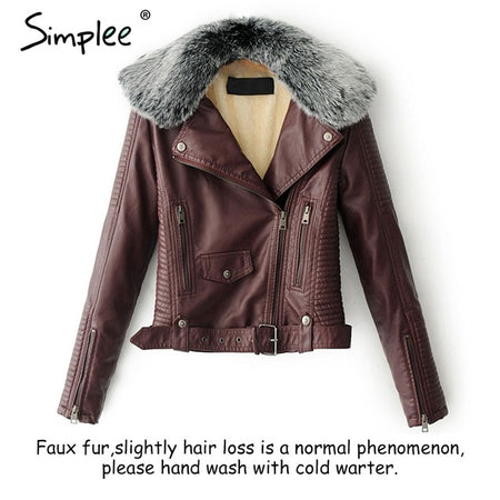 Simplee Fashion fur collar basic jacket coat outerwear coats Streetwear black faux leather coat female PU leather jacket women