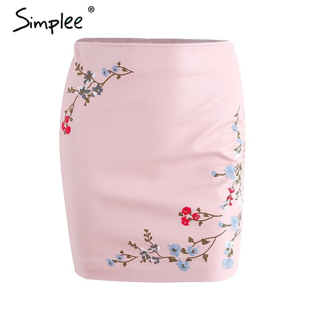 Simplee Vintage embroidery leather skirt women Elegant zipper PU pencil skirt 2017 Autumn fashion streetwear mini skirt
